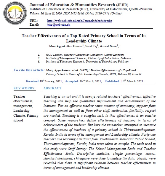 Teaching is an art and it is always related teachers’ effectiveness. Effective teaching can help the qualitative improvement and achievements of the learners. For an effective teacher some amount of autonomy, support from the management as well as from other staff, motivation, flexibility, respect etc are needed. Teaching is a complex task, in that effectiveness is an evasive concept. Some researchers define effectiveness of teachers in terms of achievements of the students. But here the researcher attempted to measure the effectiveness of teachers of a Primary school in Thiruvananthapuram, Kerala, India in terms of its management and Leadership climate. Forty one teachers and teaching assistants from Vivekananda Memorial Public School, Thiruvananthapuram, Kerala, India were taken as sample. The tools used in this study were Staff Survey: The School Management Scale & Teacher Effectiveness Scale. Descriptive statistics, simple percentage, means, Standard Deviations, chi-square were done to analyse the data. Results were revealed that there is significant relation between teacher effectiveness in terms of management and leadership climate.