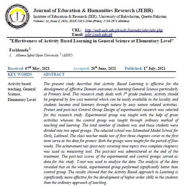 Anwer, F. (2019). The effect of Activity-Based teaching techniques on student motivation and academic achievement. Journal of Education and Educational Developement, 06(01), 154-170.