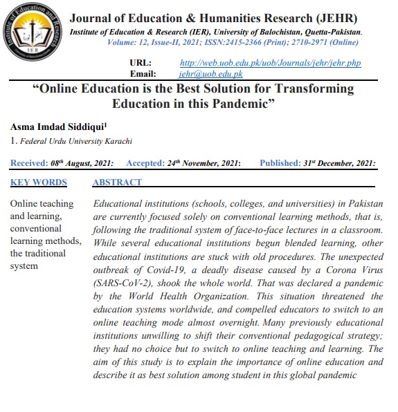Masood, A. (2021). Online Education is the Best Solution for Transforming Education in this Pandemic. Journal of Education And Humanities Research (JEHR), University of Balochistan, Quetta, 12(2), 92–98. Retrieved from http://jehronline.uob.edu.pk/journal/index.php/jehr/article/view/204