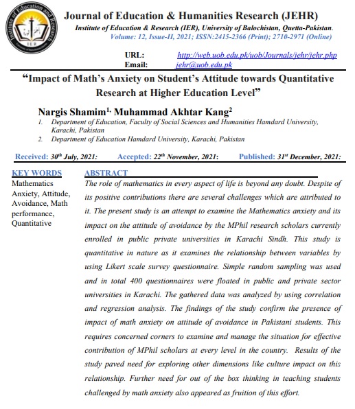 Impact of math's anxiety on Student's attitude towards Quantitative Research at Higher Education Level
