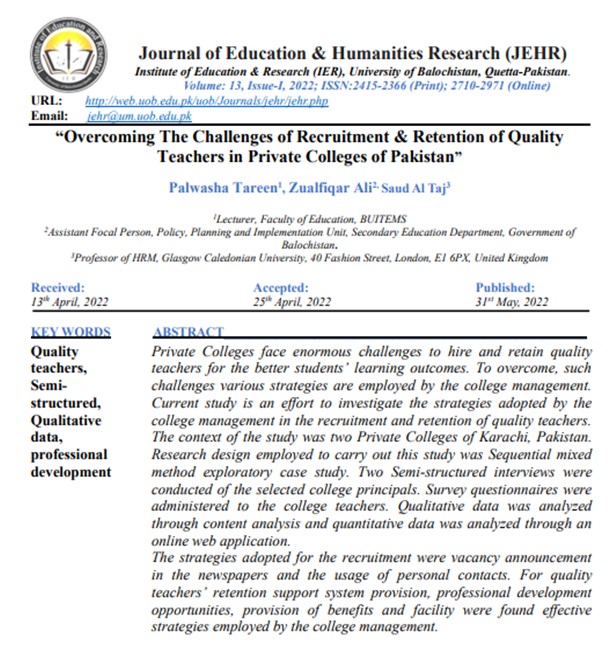 Overcoming the Challenges of Recruitment and Retention of Quality Teachers in Private Colleges of Pakistan
