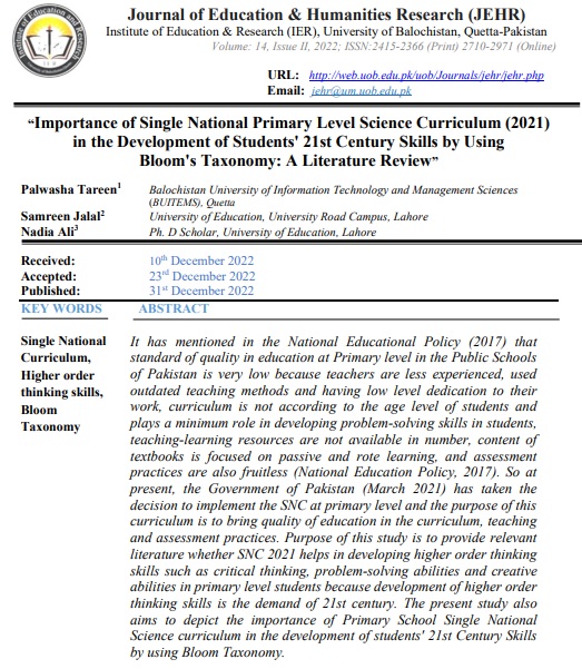 It has mentioned in the National Educational Policy (2017) that standard of quality in education at Primary level in the Public Schools of Pakistan is very low because teachers are less experienced, used outdated teaching methods and having low level dedication to their work, curriculum is not according to the age level of students and plays a minimum role in developing problem-solving skills in students, teaching-learning resources are not available in number, content of textbooks is focused on passive and rote learning, and assessment practices are also fruitless (National Education Policy, 2017). So at present, the Government of Pakistan (March 2021) has taken the decision to implement the SNC at primary level and the purpose of this curriculum is to bring quality of education in the curriculum, teaching and assessment practices. Purpose of this study is to provide relevant literature whether SNC 2021 helps in developing higher order thinking skills such as critical thinking, problem-solving abilities and creative abilities in primary level students because development of higher order thinking skills is the demand of 21st century. The present study also aims to depict the importance of Primary School Single National Science curriculum in the development of students' 21st Century Skills by using Bloom Taxonomy.