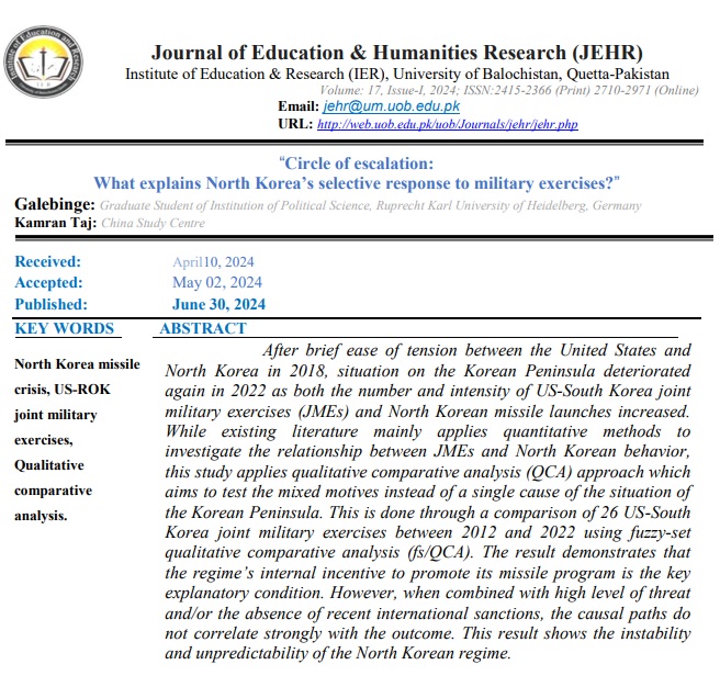 After brief ease of tension between the United States and North Korea in 2018, situation on the Korean Peninsula deteriorated again in 2022 as both the number and intensity of US-South Korea joint military exercises (JMEs) and North Korean missile launches increased. While existing literature mainly applies quantitative methods to investigate the relationship between JMEs and North Korean behavior, this study applies qualitative comparative analysis (QCA) approach which aims to test the mixed motives instead of a single cause of the situation of the Korean Peninsula. This is done through a comparison of 26 US-South Korea joint military exercises between 2012 and 2022 using fuzzy-set qualitative comparative analysis (fs/QCA). The result demonstrates that the regime’s internal incentive to promote its missile program is the key explanatory condition. However, when combined with high level of threat and/or the absence of recent international sanctions, the causal paths do not correlate strongly with the outcome. This result shows the instability and unpredictability of the North Korean regime