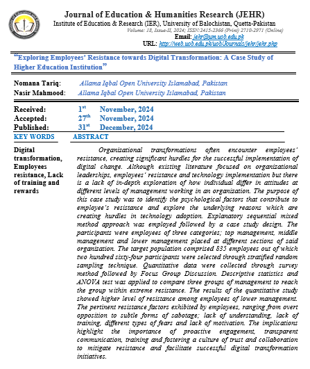 Tariq, N., & Mehmood, N. (2024). Exploring Employees’ Resistance towards Digital Transformation: A Case Study of Higher Education Institution. Journal of Education And Humanities Research (JEHR), University of Balochistan, Quetta, 18(02), Page 113–135. Retrieved from http://jehronline.uob.edu.pk/journal/index.php/jehr/article/view/502