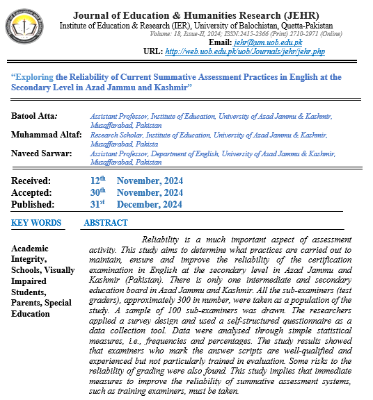 Exploring the Reliability of Current Summative Assessment Practices in English at the Secondary Level in Azad Jammu and Kashmir