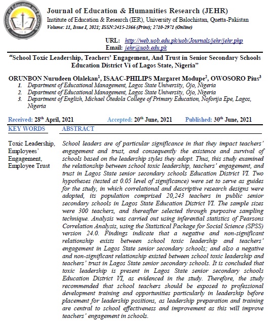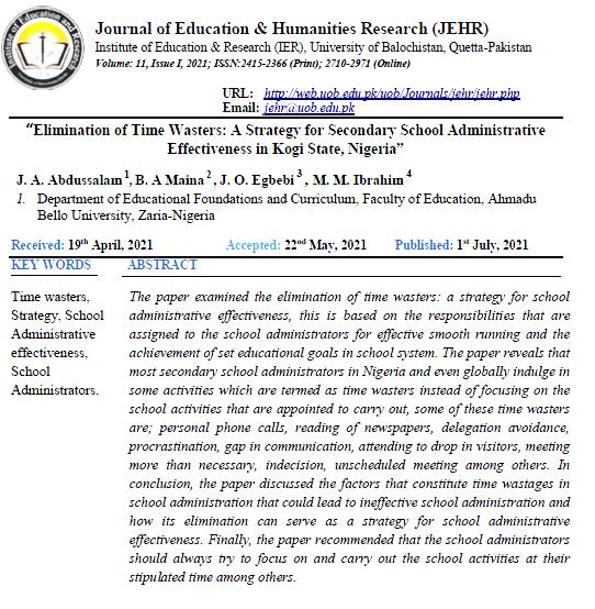Vol. 11 No. 1 (2021): Journal of Education & Humanities Research (JEHR)