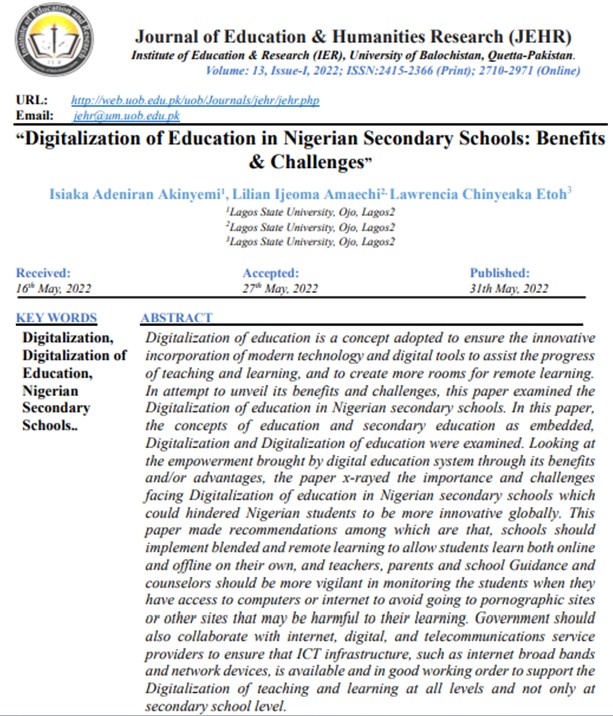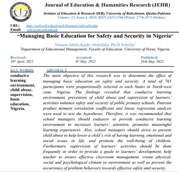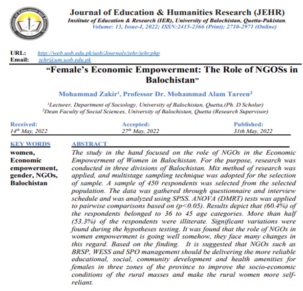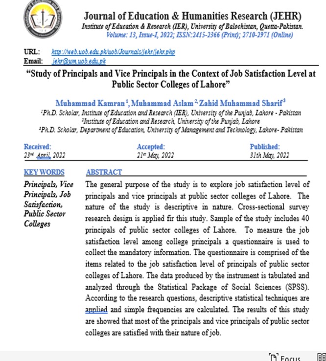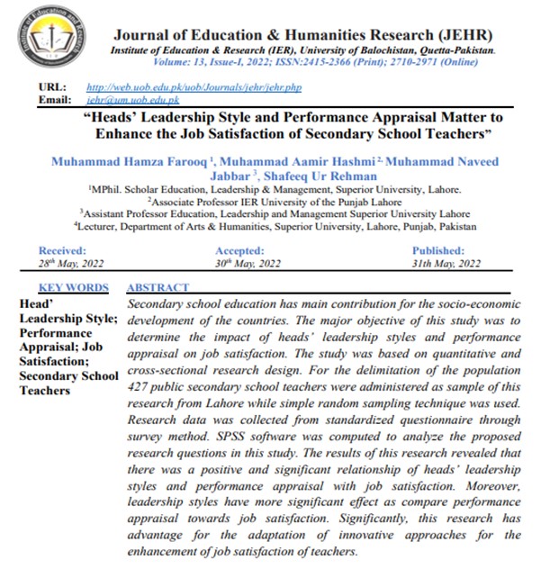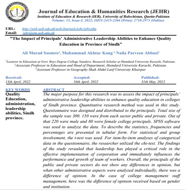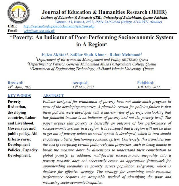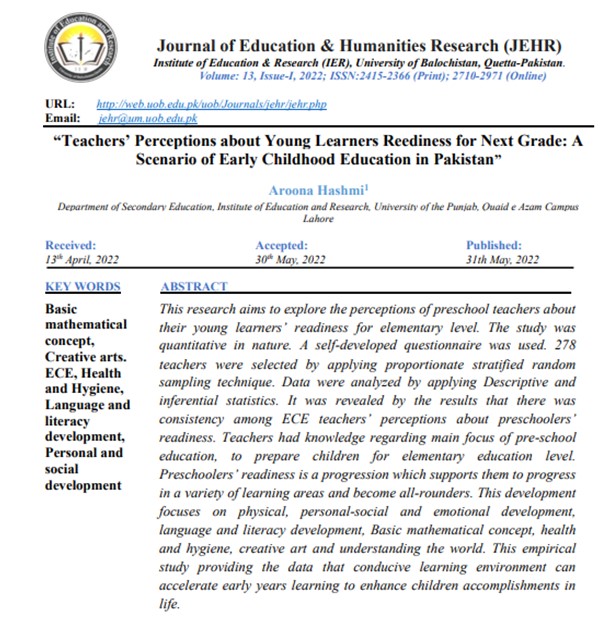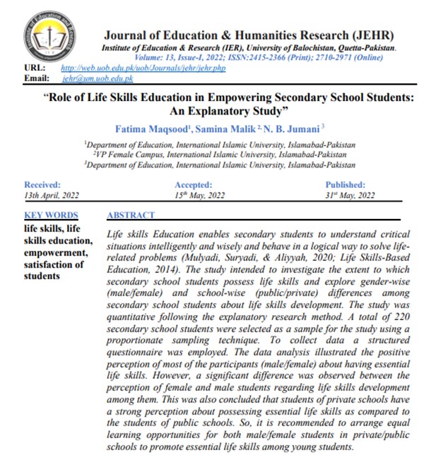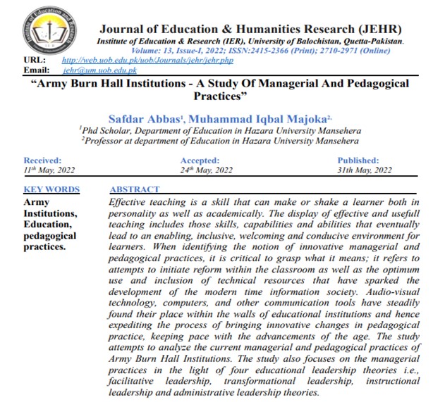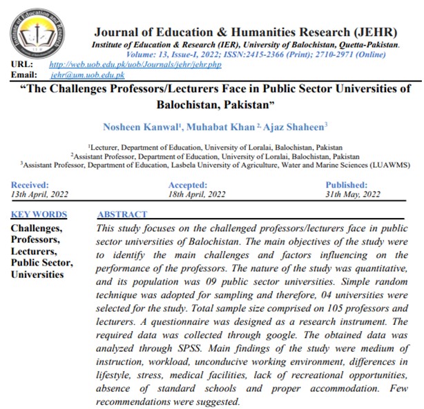 View Vol. 13 No. 1 (2022): Journal of Education & Humanities Research (JEHR), University of Balochistan, Quetta-Pakistan