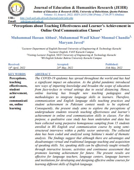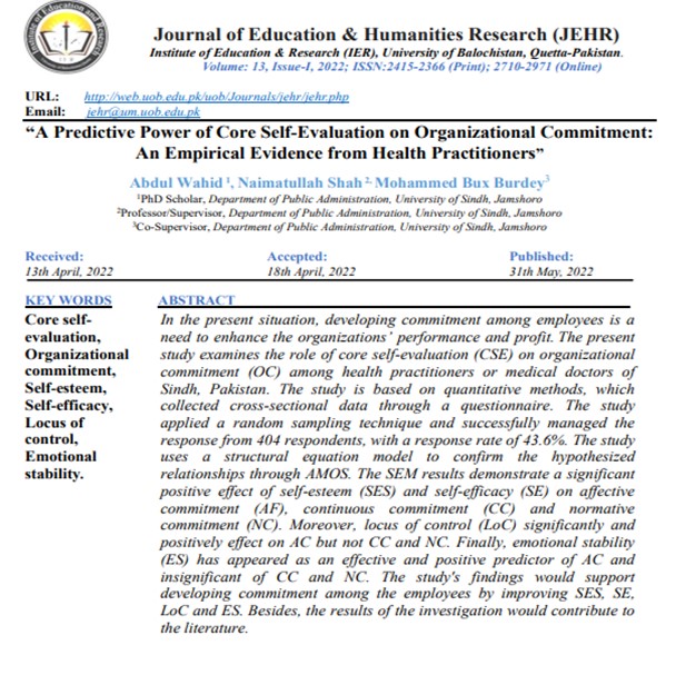 Vol. 13 No. 1 (2022): Journal of Education & Humanities Research (JEHR), University of Balochistan, Quetta-Pakistan
