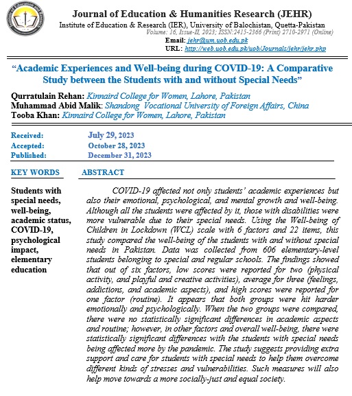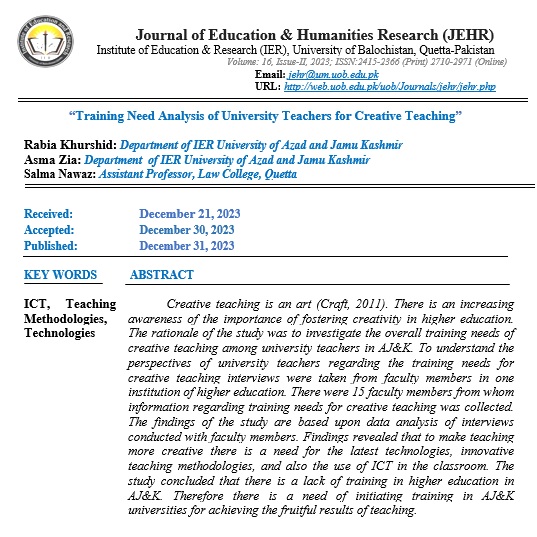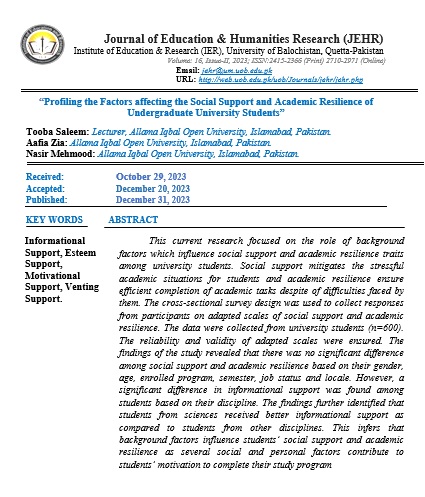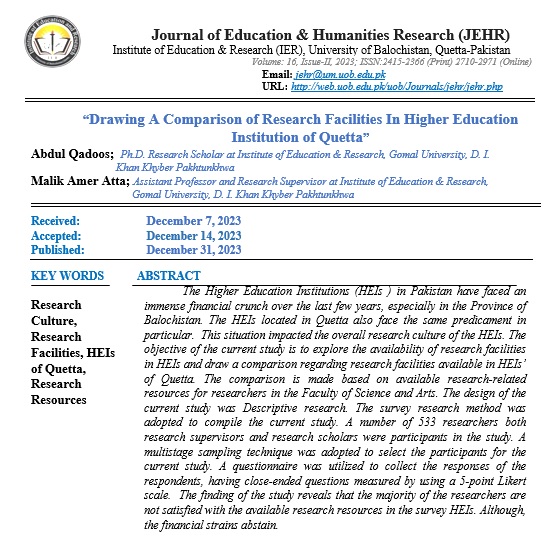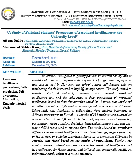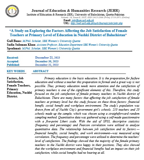 Vol. 16 No. 2 (2023): Journal of Education & Humanities Research (JEHR), University of Balochistan, Quetta-Pakistan