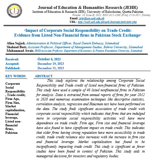 Impact of Corporate Social Responsibility on Trade Credit: Evidence from Listed Non-Financial firms in Pakistan Stock Exchange