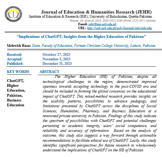Implications of ChatGPT: Insights from the Higher Education of Pakistan