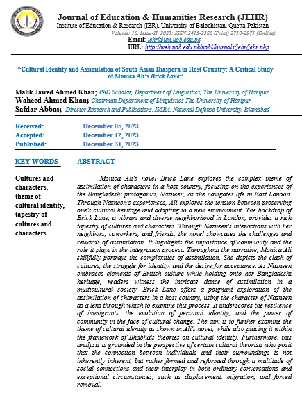 Cultural Identity and Assimilation of South Asian Diaspora in Host Country: A Critical Study of Monica Ali’s Brick Lane