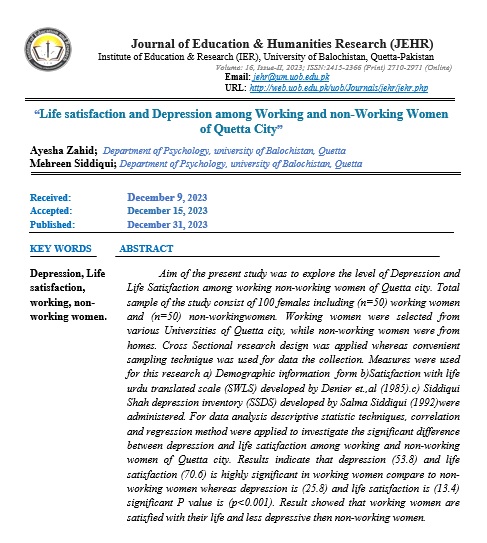 Life satisfaction and Depression among Working and non-Working Women of Quetta City