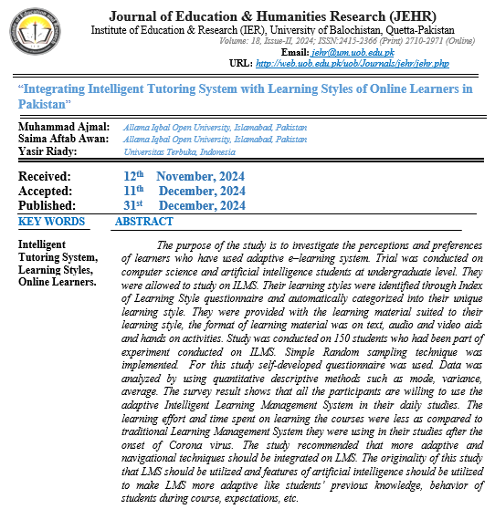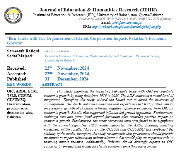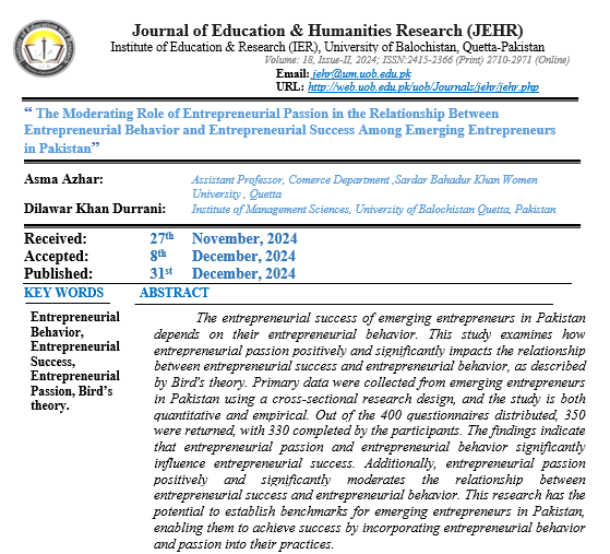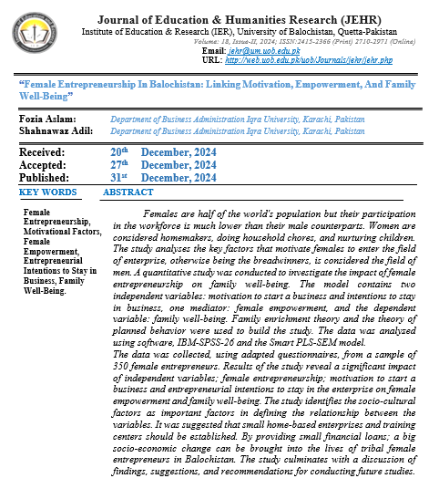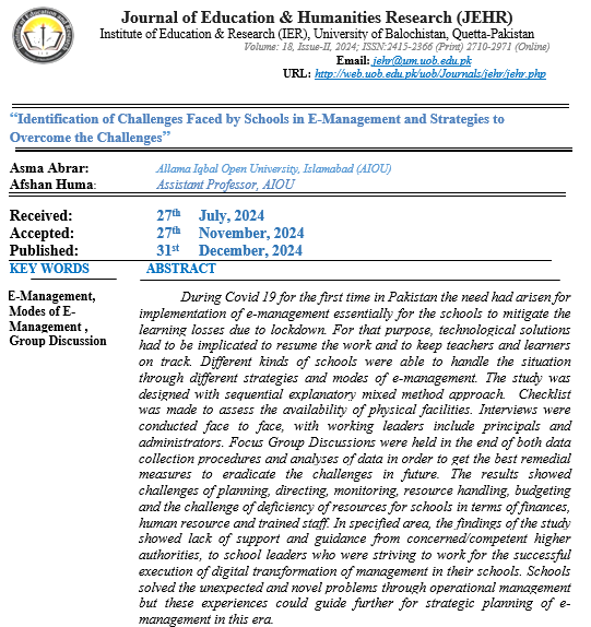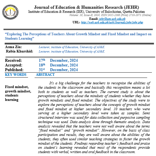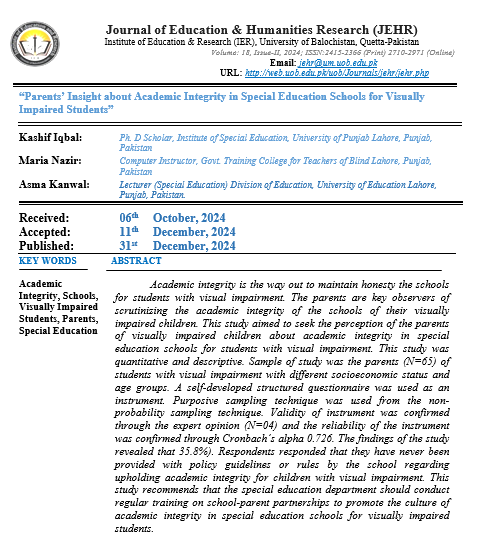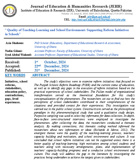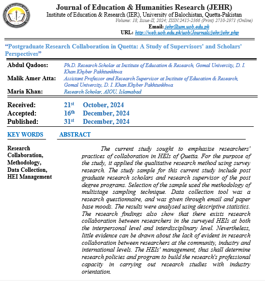 Vol. 18 No. 02 (2024): Journal of Education and Humanities Research (JEHR), University of Balochistan, Quetta-Pakistan