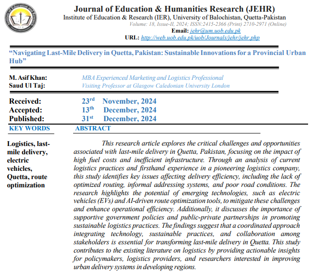 Navigating Last-Mile Delivery in Quetta, Pakistan: Sustainable Innovations for a Provincial Urban Hub