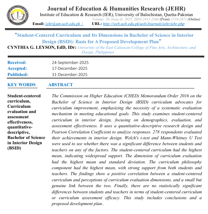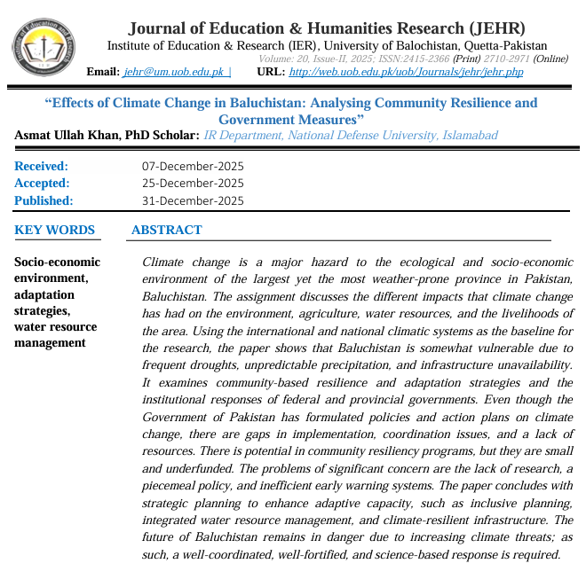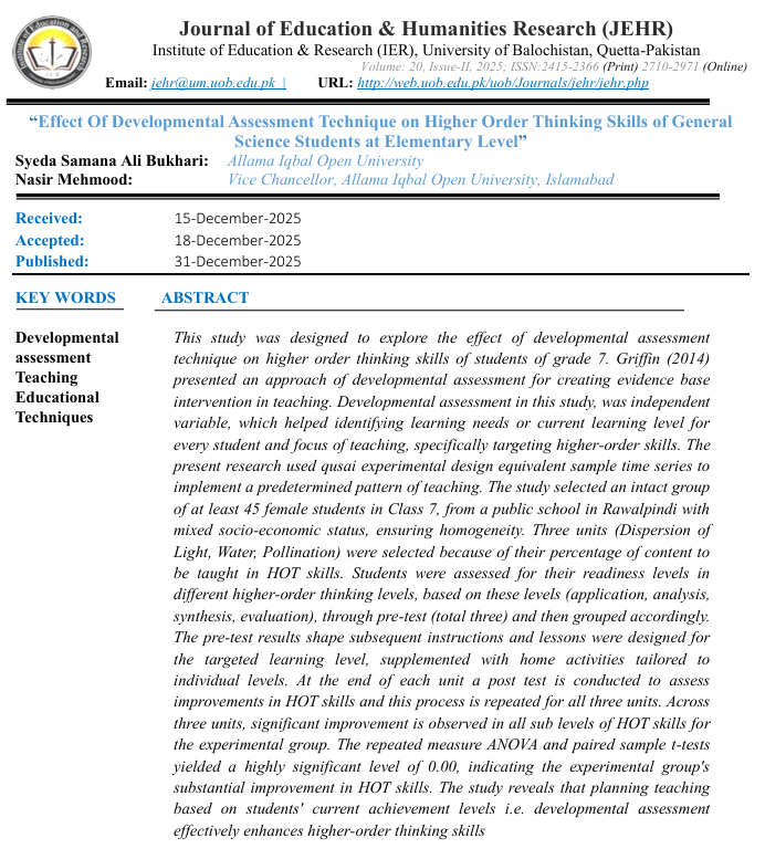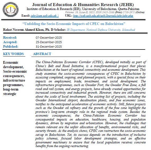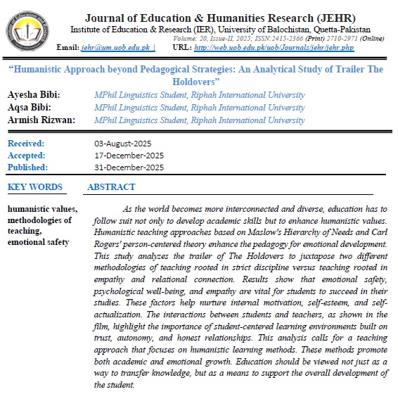 Vol. 20 No. 2 (2025): Journal of Education and Humanities Research (JEHR), University of Balochistan, Quetta-Pakistan