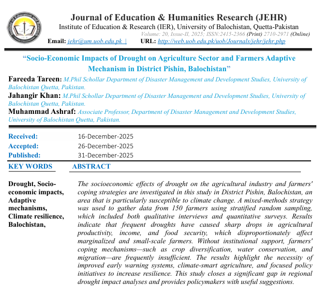 Socio-Economic Impacts of Drought on Agriculture Sector and Farmers Adaptive Mechanism in District Pishin, Balochistan